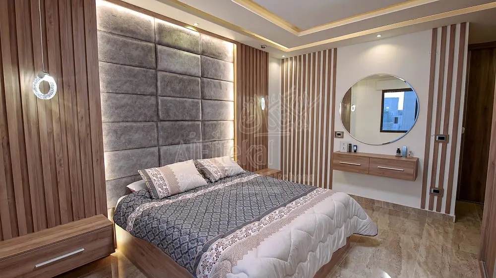 الإضاءة المخصصة: نقوم بتصميم خطط إضاءة متعددة المستويات توفر إضاءة عامة مريحة للاسترخاء وإضاءة عملية مخصصة للقراءة، مما يمنحك تحكماً كاملاً في أجواء الغرفة.